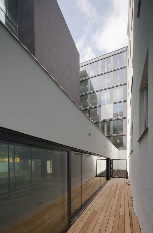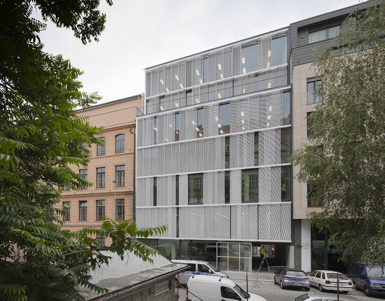 Na Radlické ulici objekt přirozeně vstupuje mezi dva hodně odlišné sousedy.