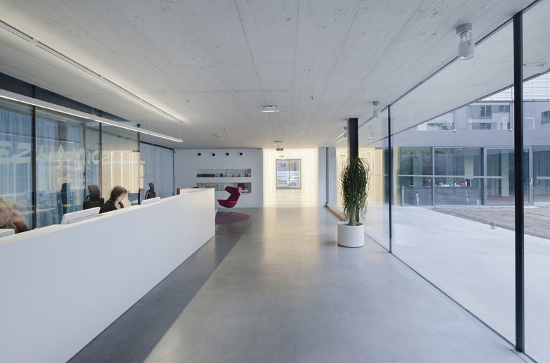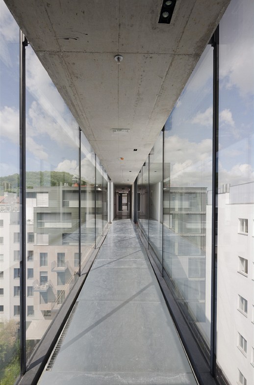 Vizuálně atraktivní vstupní chodba řeší nedostatek přirozeného světla pásy LED svítidel.