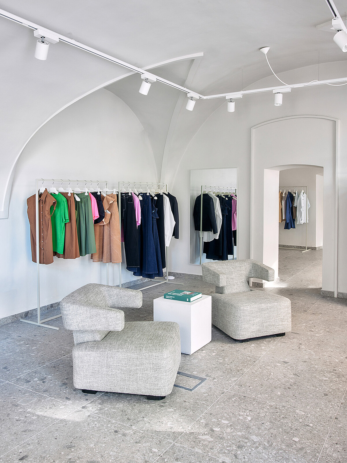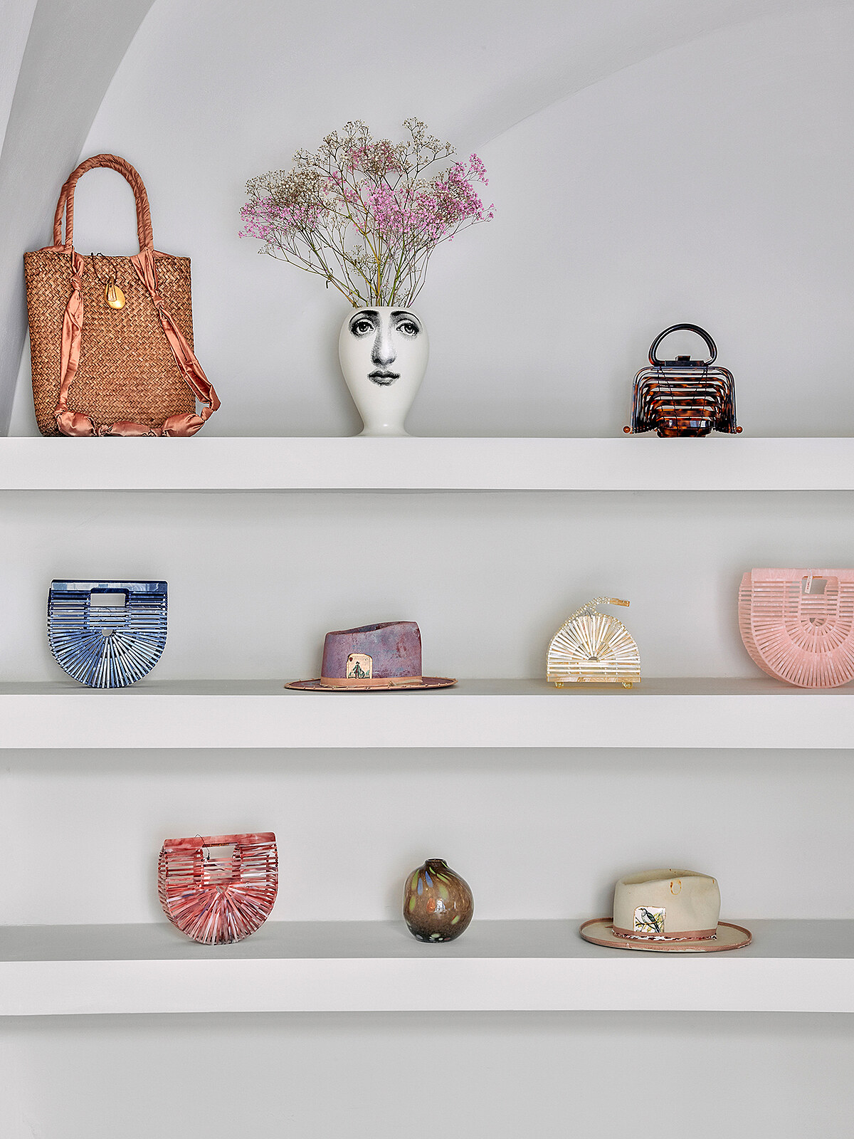 Interiér Symbols zdobí pár citlivě vybraných objektů, jako je obraz Nicolase Makelbergeho (v obchodě k zakoupení) nebo vázy od Anissy Kermiche a Fornasetti s květinami od Avgust Flowers.
