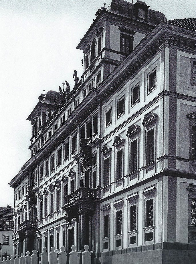Kupka a Nepraš. Průčelí Toskánského paláce s kamennými kuželkami