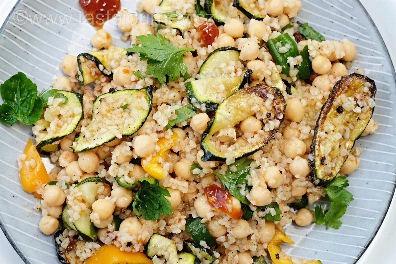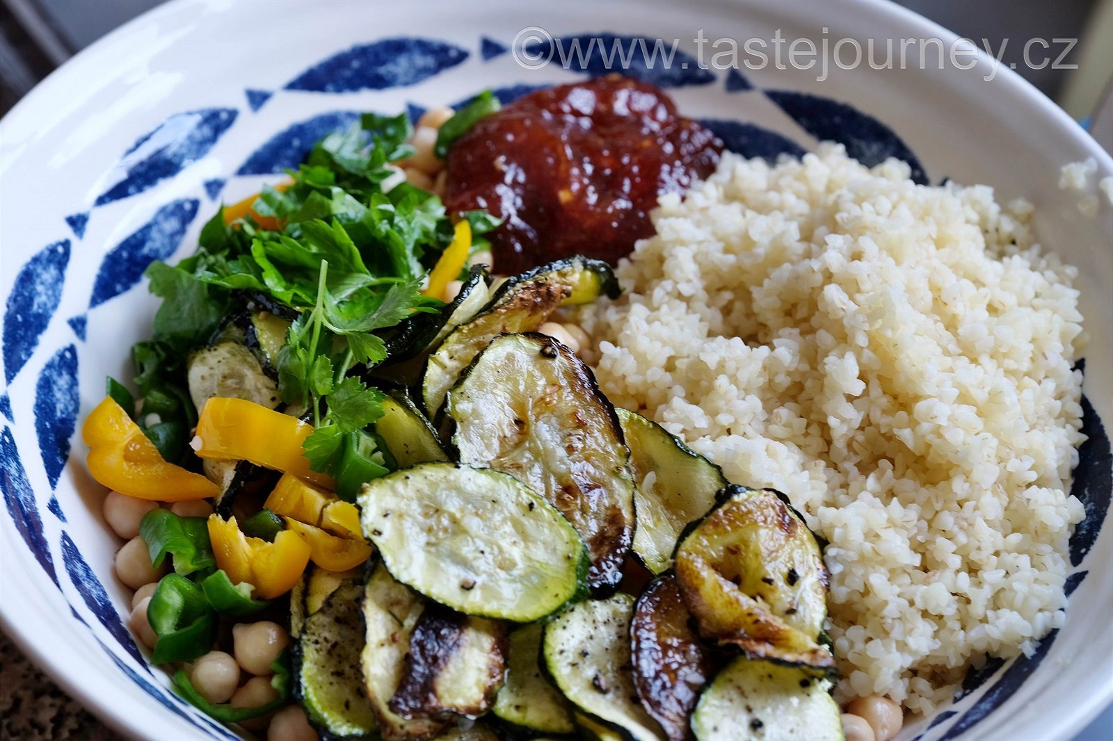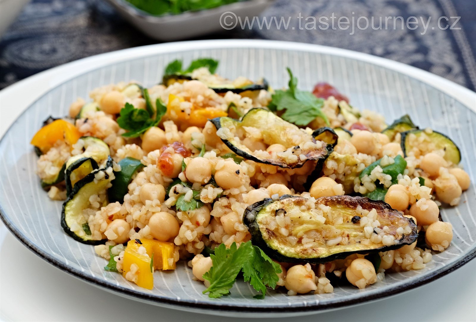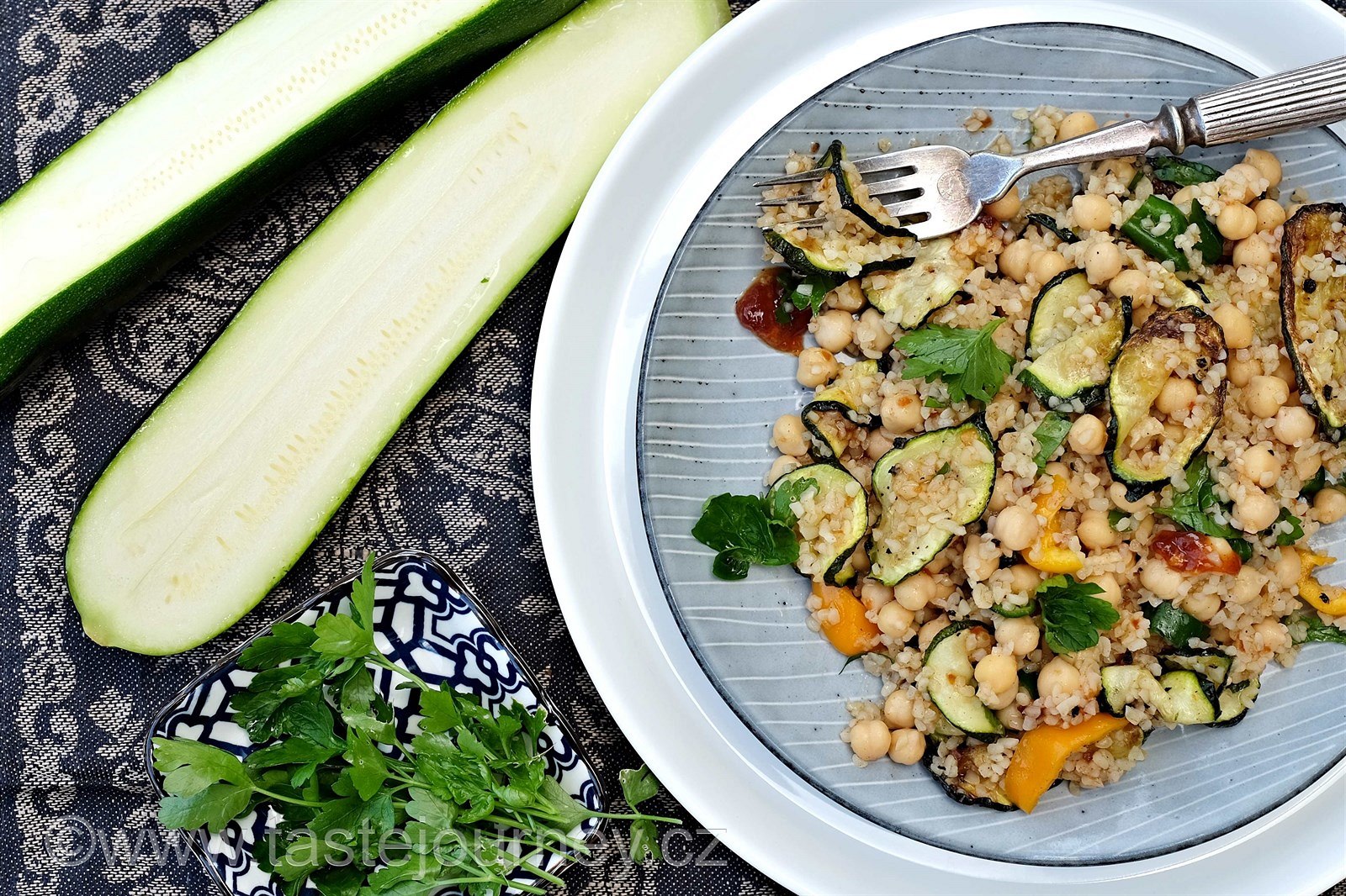Salát s cuketou, cizrnou, bulgurem a paprikami