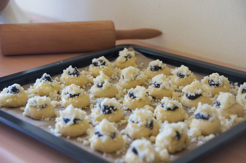 Pokud děláte koláčky také s povidly, udělejte v takto připraveném koláčku ještě prstem důlek, zakápněte povidly a až poté obalte v drobence.