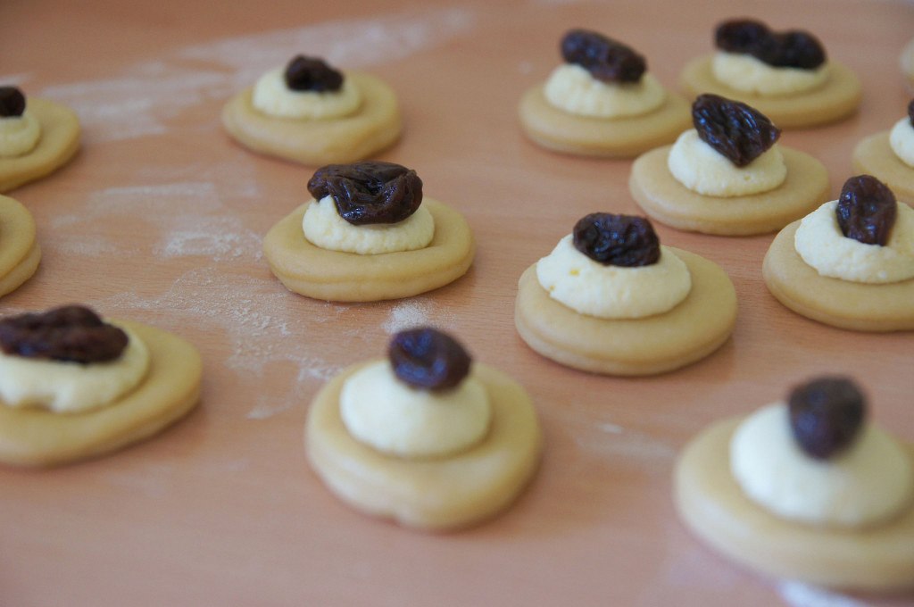 Do cukrářských sáčků si přichystejte náplně, kterými budete koláčky plnit. Do středu každého kolečka nastříkejte trochu tvarohové náplně, položte rozinku namočenou rumu a zabalte do tvaru koláčku.