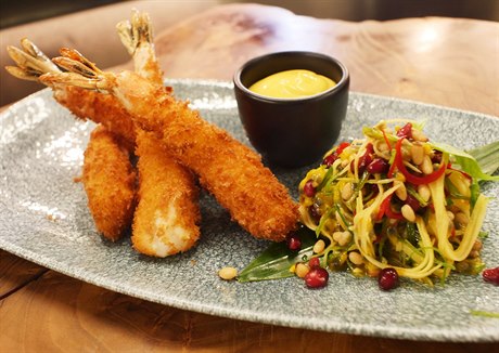 Smažené krevety servírujeme společně s mango majonézou a salátem ze zeleného manga a mučenky.