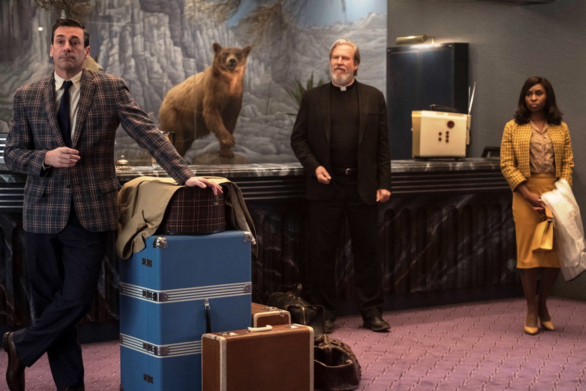 Co je čeká? Obchodní cestující Seymour Sullivan (Jon Hamm), kněz Daniel Flynn (Jeff Bridges) a zpěvačka Darlene Sweet (Cynthia Erivová). snímek Zlý časy v El Royale (2018). Režie: Drew Goddard.