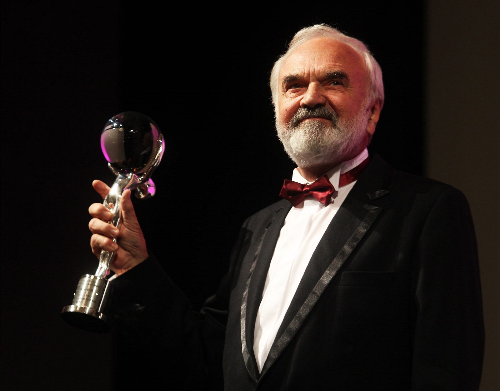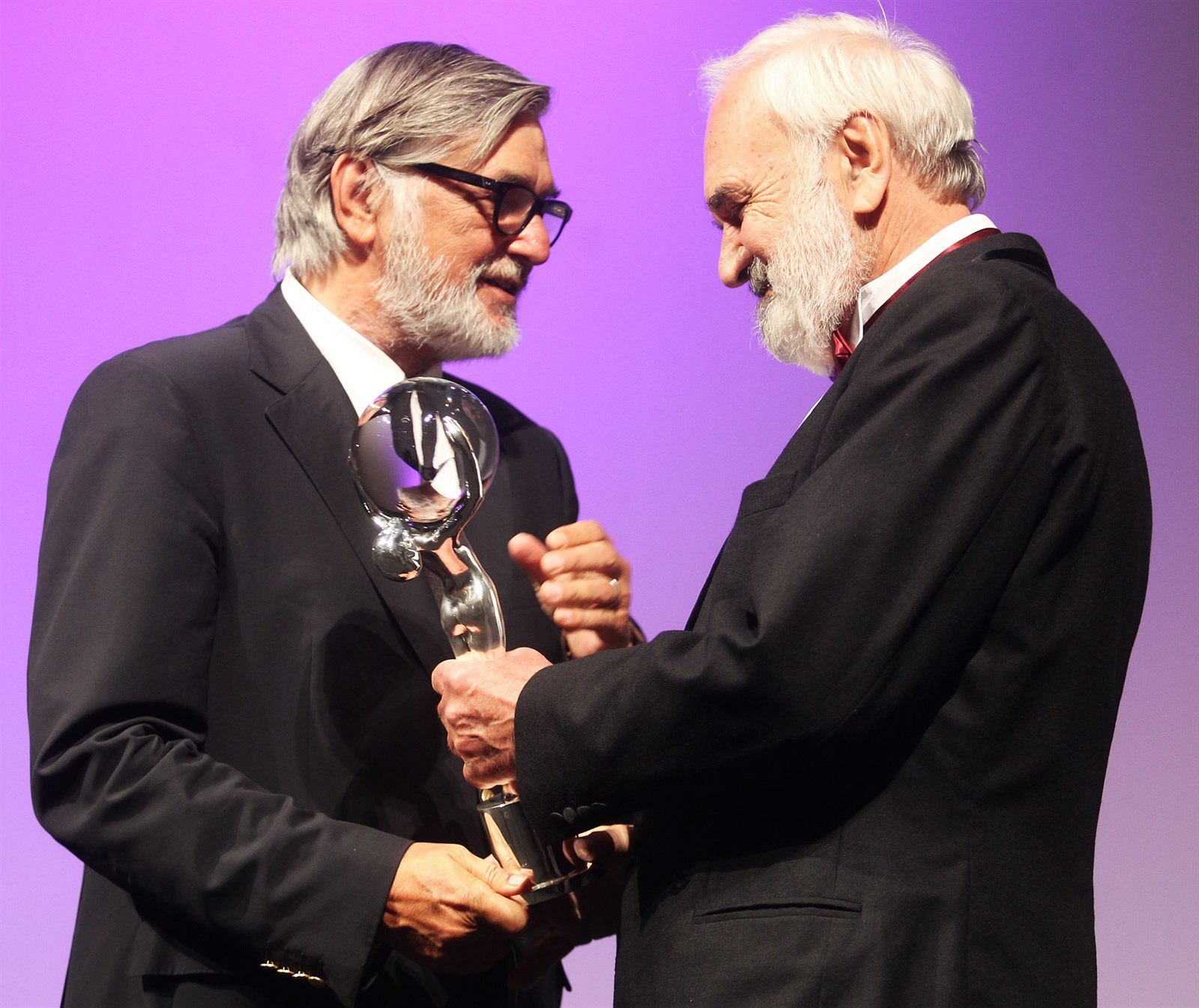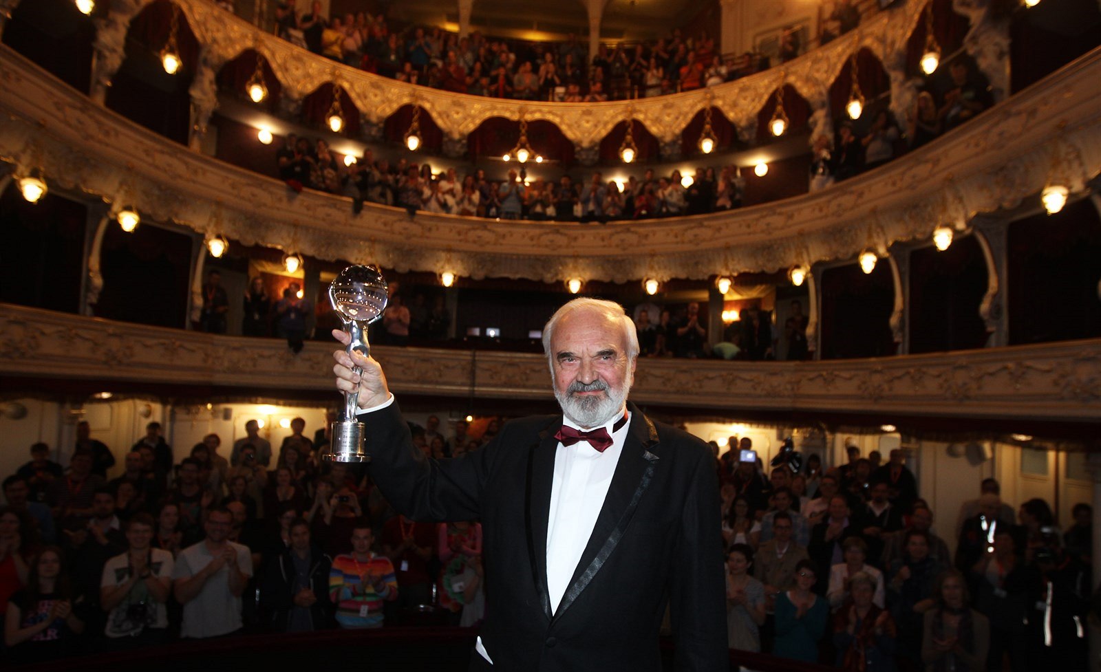 Zdeněk Svěrák převzal na Mezinárodním filmovém festivalu v Karlových Varech z rukou Jiřího Bartošky Cenu prezidenta festivalu za přínos české kinematografii