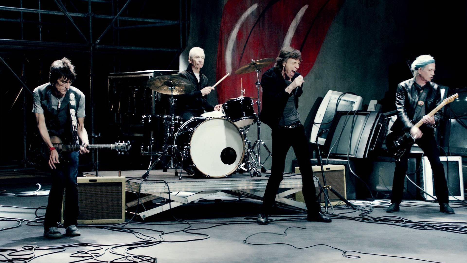 Rolling Stones (zleva Ronnie Wood, Charlie Watts, Mick Jagger a Keith Richards) při natáčení alba Grrr! v Paříži.
