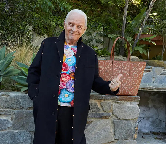 S přirozeností sobě vlastní tak Hopkins na snímcích pózuje v černé mikině s logem Loewe a teniskách Flow Runners s typickou podrážkou, která olizuje patu i špičku boty. Další propagační fotografie ukazuje držitele mnoha filmových ocenění v tričku s potiskem duhových donutů, přes ramena má kabát s blyštivými cvočky a rozjařeně ukazuje na slavnou kabelku Anagram. Tu firma založená již v roce 1846 vyrábí v různých obměnách i velikostech. Její cena začíná na 21 tisících a může se vyšplhat k půvabným 57 tisícům korun. Inu, pěkná to investiční kabelka.