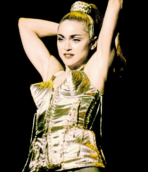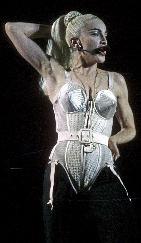 Madonna a její outfit. Nejslavnějším a určitě nejčastěji kopírovaným Madonniným outfitem je korzet se špičatou podprsenkou od Jeana-Paula Gaultiera ze zpěvaččina slavného turné v roce 1990.