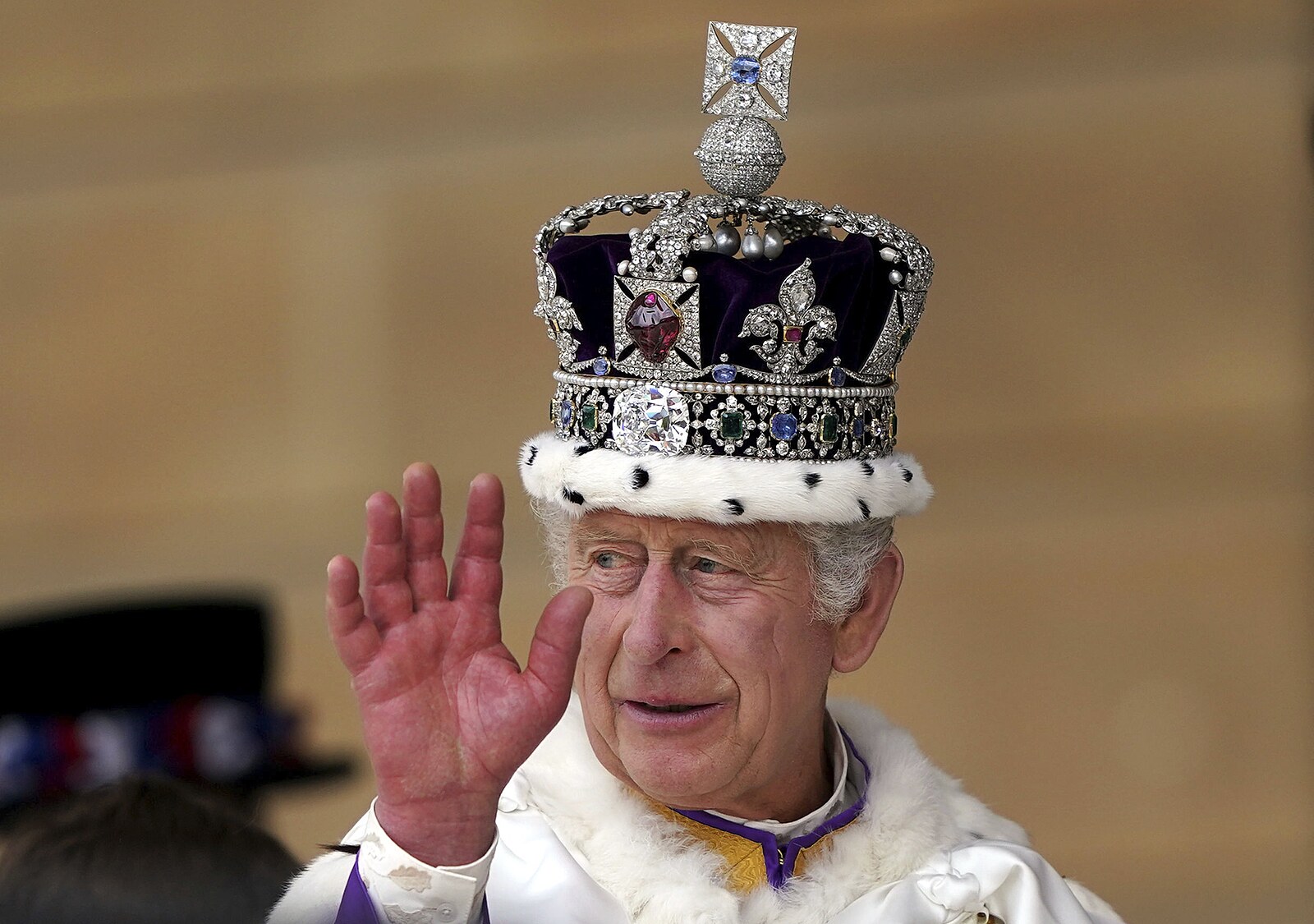 Britský král Karel III. přijímá královskou poctu od příslušníků armády v zahradách Buckingham Place po korunovaci krále Karla III. a královny Camilly. (6. května 2023)