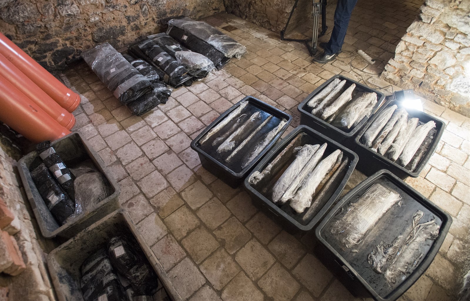 Na snímku z 9. ledna 2019 jsou části studny uložené v konzervačním roztoku na Fakultě restaurování v Litomyšli.