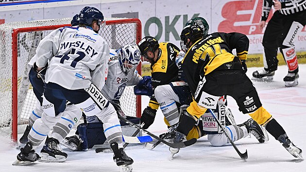 Přejít na online reportážVítkovice – Litvínov 4:1Úvod duelu sice přinesl hned tři vyloučení, avšak první velké šance se diváci v Ostravar Aréně dočkali až při vyrovnaném počtu hráčů. Po přečíslení dvou proti jednomu pálil pohotově Maštalířský, proti kterému se však stihl přesunout Hrachovina. Poněkud opatrný hokej poté trochu rozproudila přesilovka hostů, při které Ondřej Kaše nahrnul kotouč do brankoviště, kde jej však Verva nedokázala dotlačit za brankovou čáru. Hrachovina následně odolal i dalším ranám Hlavy a Šenkeříka, kteří se marně snažili využít početní výhodu. Posléze první dějství pokračovalo nastoleným trendem bez větších šancí a do kabin se tak šlo za bezbrankového stavu. Po pěti minutách prostřední části o sobě poprvé v utkání dali vědět vážněji domácí. Povedenou pasáž v ofenzívě se snažili přetavit v branku Yetman, Abdul a také Demel, ale ani jeden z nich nebyl úspěšný. Až v 26. minutě se diváci dočkali gólu. Hrivík to udělal náramně, když zadovkou vyřadil ze hry dva soupeře a následně osamocený Edmonds mezi kruhy prostřelil Tomka. Ostravané se poté ubránili nebezpečným ranám při vlastním oslabení a naopak mohli zvýšit. Rychlý brejk zakončil pěknou střelou Nellis, který orazítkoval levou tyč. Vítkovice se ale druhého zásahu dočkaly ještě ve druhé třetině, byť v jejím samotném závěru. Přesilovková rána od modré čáry se od klubka hráčů odrazila k Nellisovi, jenž z pravé strany zametl puk do prázdné brány. Do třetí části nastoupili lépe hosté, avšak Vítkovice v čele s Hrachovinou v bráně odolaly všem pokusům. Na druhé straně se poté před brankovištěm snažil zasunout puk Lednický, ale v pádu mířil mimo. Ve 49. minutě propukla radost v ostravské hale potřetí. Nellisovu střílenou přihrávku od modré čáry šikovně tečoval do horního růžku Abdul, který tak dal větší klid na hokejky svých spoluhráčů. Krátce poté ujel při vlastním oslabení Yetman, nicméně v obtížné pozici neprocedil kotouč za Tomka počtvrté. Po vypršení ostravského trestu uháněl do přečíslení Demel s Hladonikem, který po ideálním pasu nepřekonal soupeřova brankáře. Jiskřičku naděje tak v 54. minutě hostům vykřesal Maštalířský, který využil zmatku domácích za bránou Hrachoviny a pohotovu střelou upravil na rozdíl dvou gólů. Litvínov zkusil v závěru zvrátit výsledek ve hře bez brankáře, při které ale inkasoval čtvrtou branku. Od červené čáry totiž mířil přesně znovu Abdul, jenž tak upravil na konečných 4:1. Zobrazit více Sbalit |