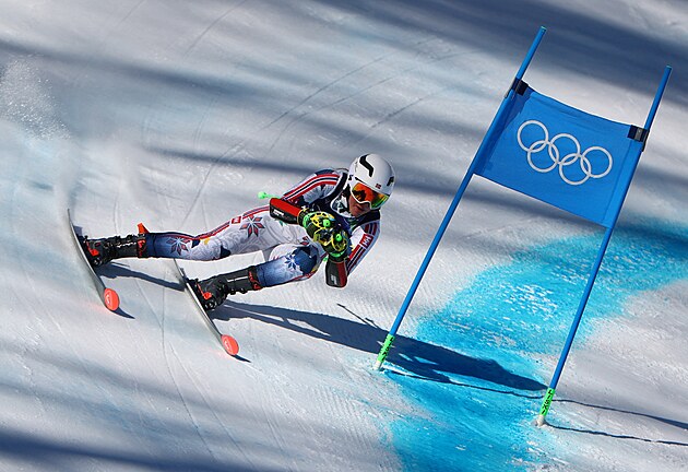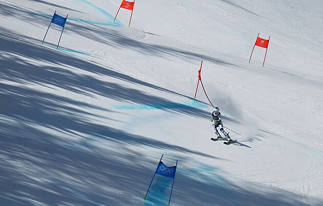 Alice Robinsonová z Nového Zélandu v akci během závodu obřího slalomu žen. (15. února 2026)