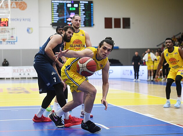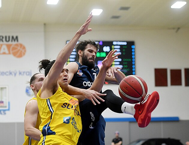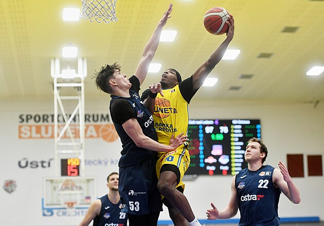 Ústecký Nick Johnson útočí na koš, bránit se ho snaží ostravský Adam Ivánek.