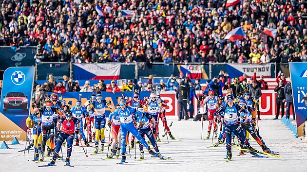 DO BOJE. Biatlonistky s vyprodanými tribunami v zádech vyráží na trať závodu s hromadným startem. |