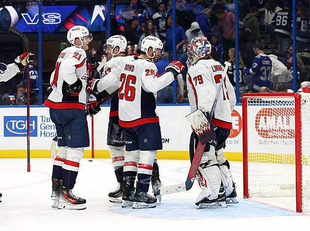 Spoluhráči se radují s brankářem Charliem Lindgrenem po vítězství nad Tampou.