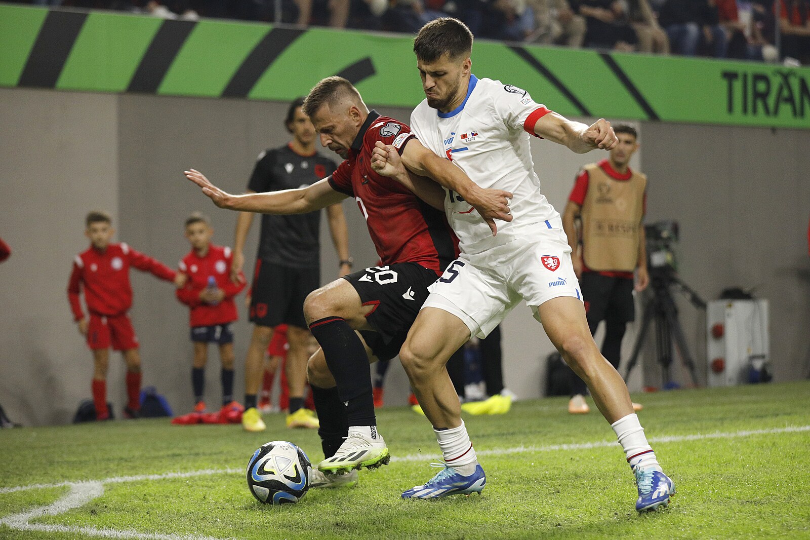 Český obránce David Jurásek v kvalifikačním utkání v Tiraně atakuje albánského protivníka Ramadaniho.