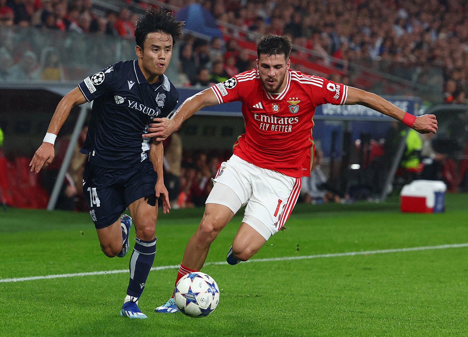 David Jurásek v dresu Benfiky (vpravo) uniká Takefusu Kubovi.