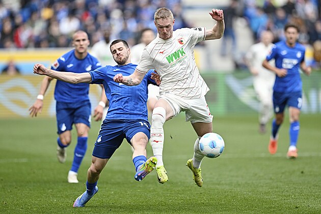 Obránce Hoffenheimu David Jurásek (vlevo) se snaží zastavit akci Augsburgu.