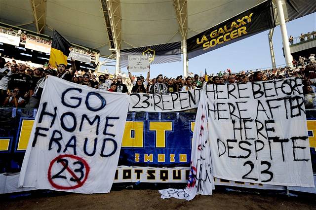 Vyprodaný stadion pro 27 tisíc fanoušků na Beckhama při utkání neustále pískal a mezi diváky se objevily i posměšné a nenávistné nápisy. "Vrať se domů, podvodníku," stálo například na jednom z nich.