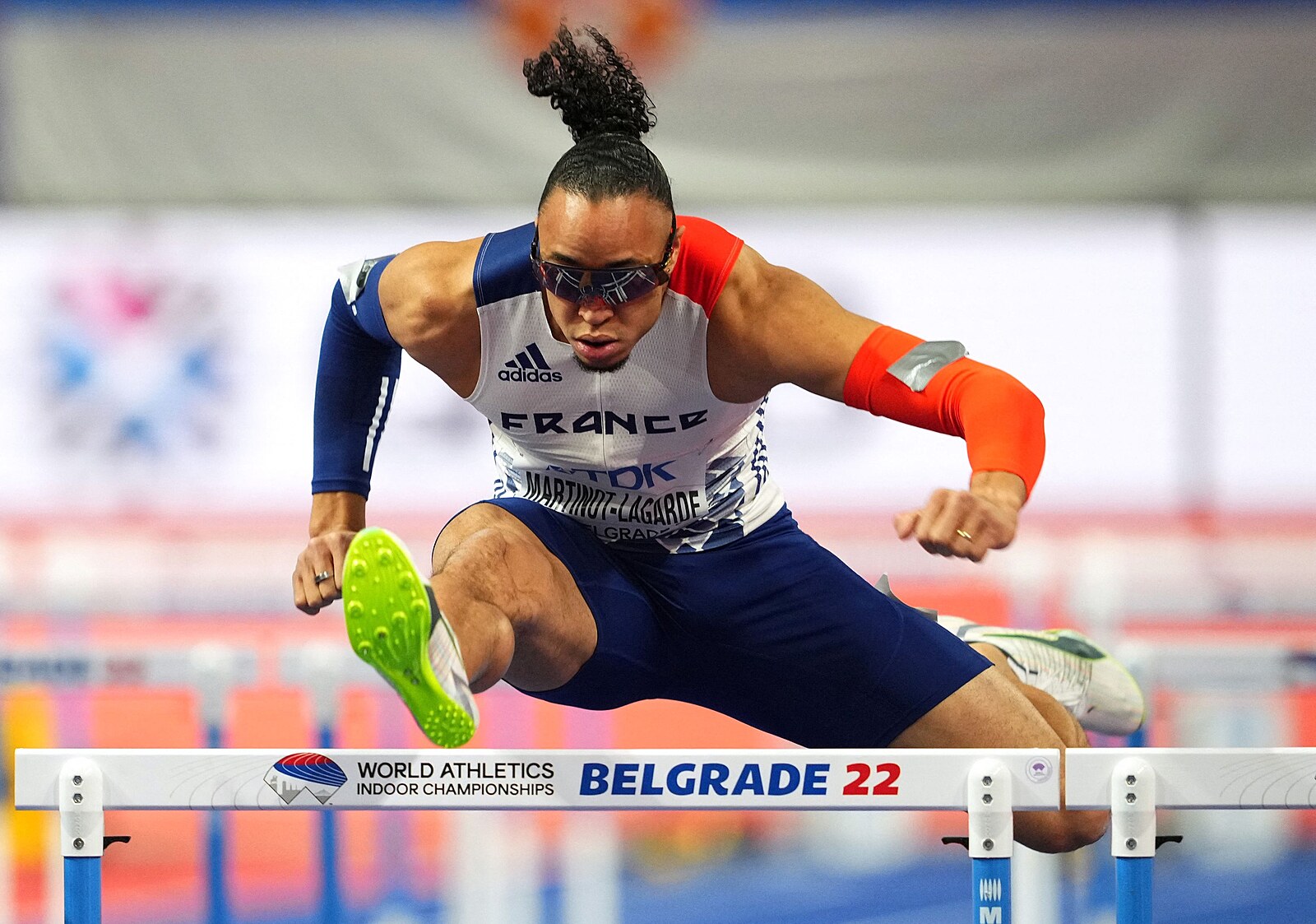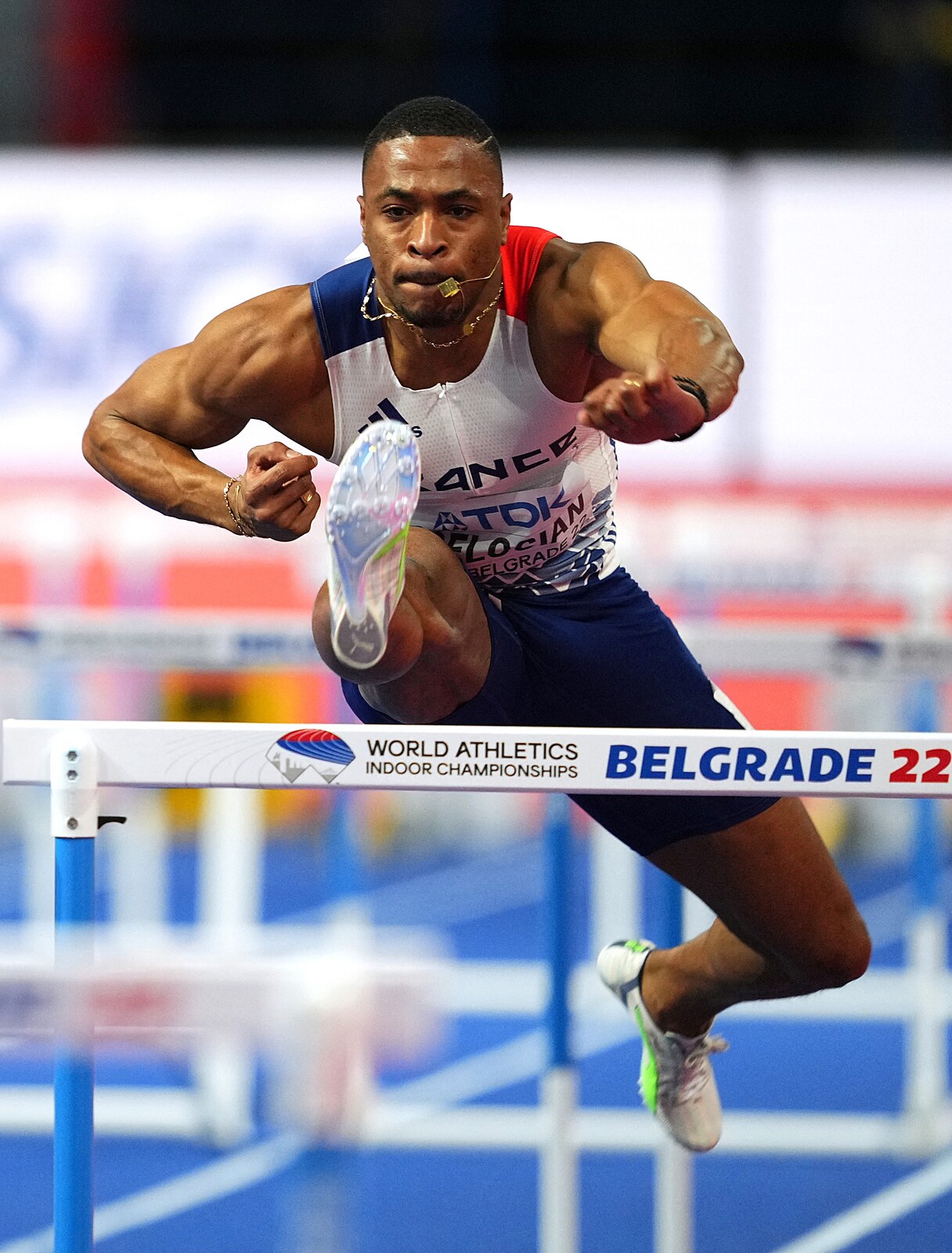Francouzský překážkář Wilhem Belocian ve svém rozběhu na halovém mistrovství světa v Bělehradě