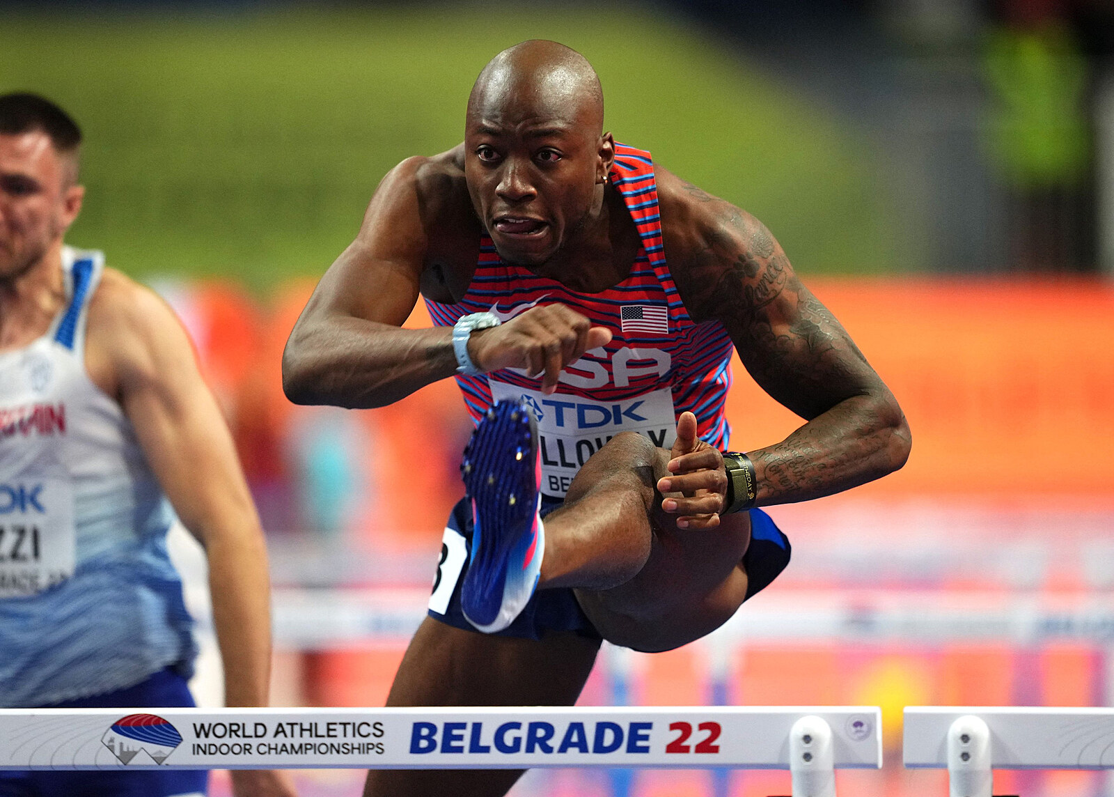 Americký překážkář Grant Holloway při svém rozběhu na halovém mistrovství světa v atletice v Bělehradě