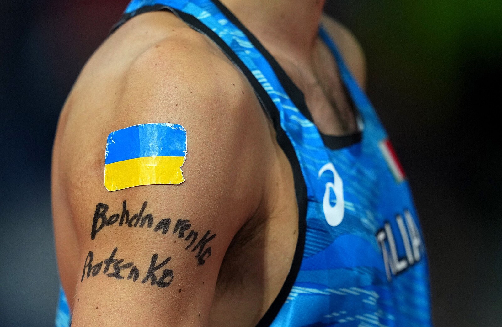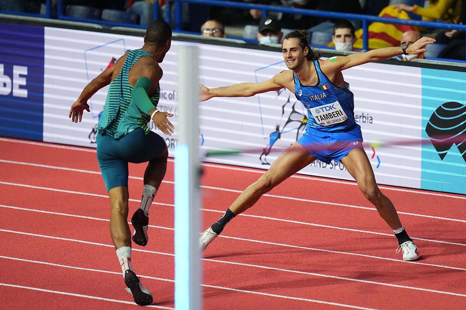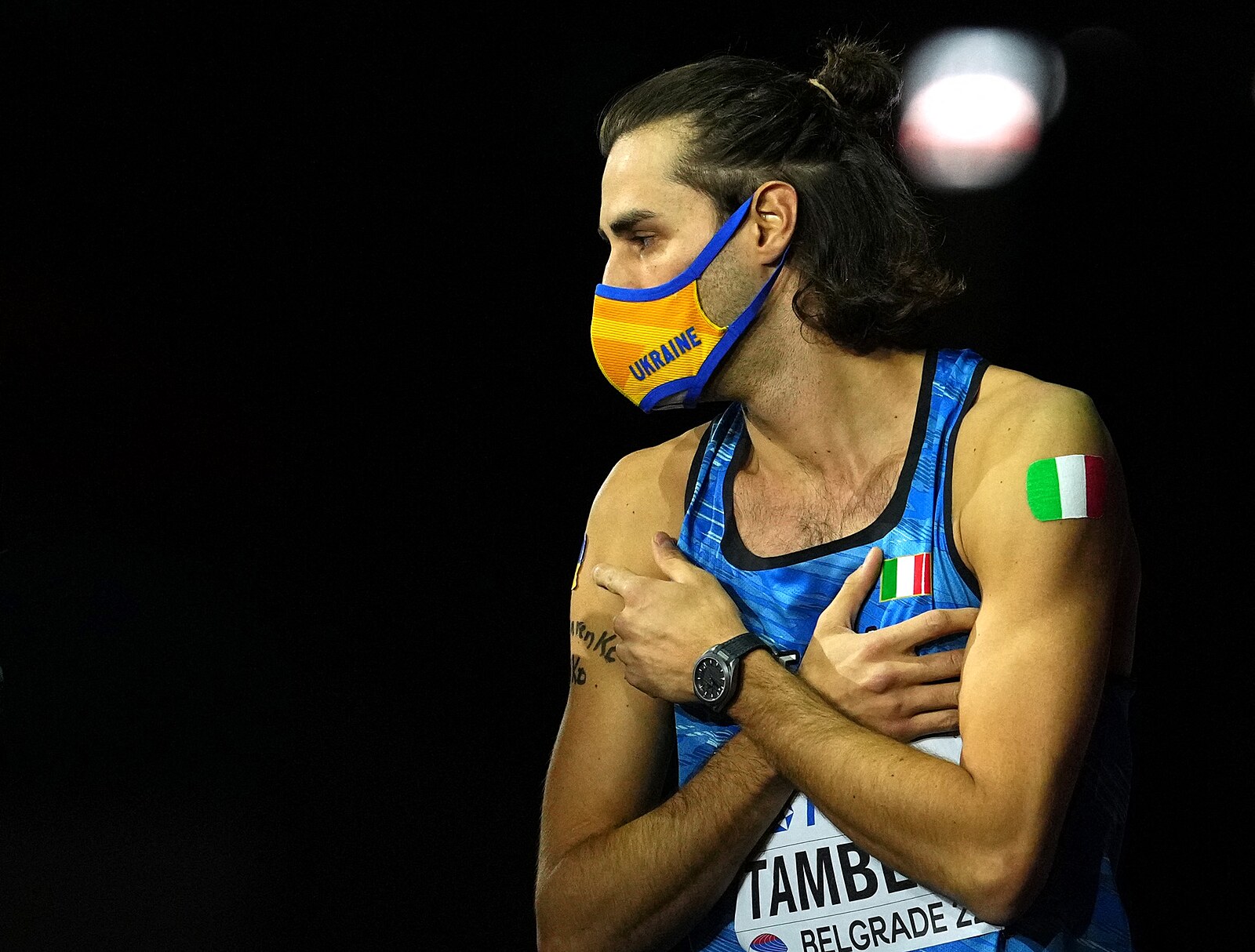 Italský výškař Gianmarco Tamberi nosí na ramenou italskou i ukrajinskou vlajku, aby vyjádřil solidaritu se zemí, v níž Rusko rozpoutalo válku. Ústa a nos si pak zakryl ukrajinským respirátorem.