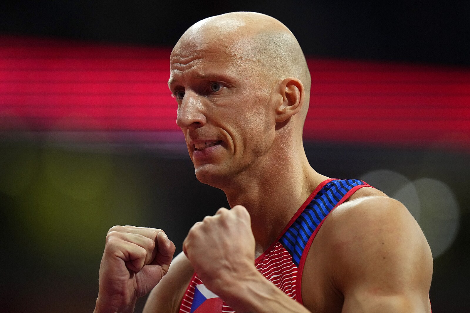 Český překážkář Petr Svoboda oslavuje vítězství v rozběhu a postup do semifinále halového mistrovství světa v Bělehradě 2022.