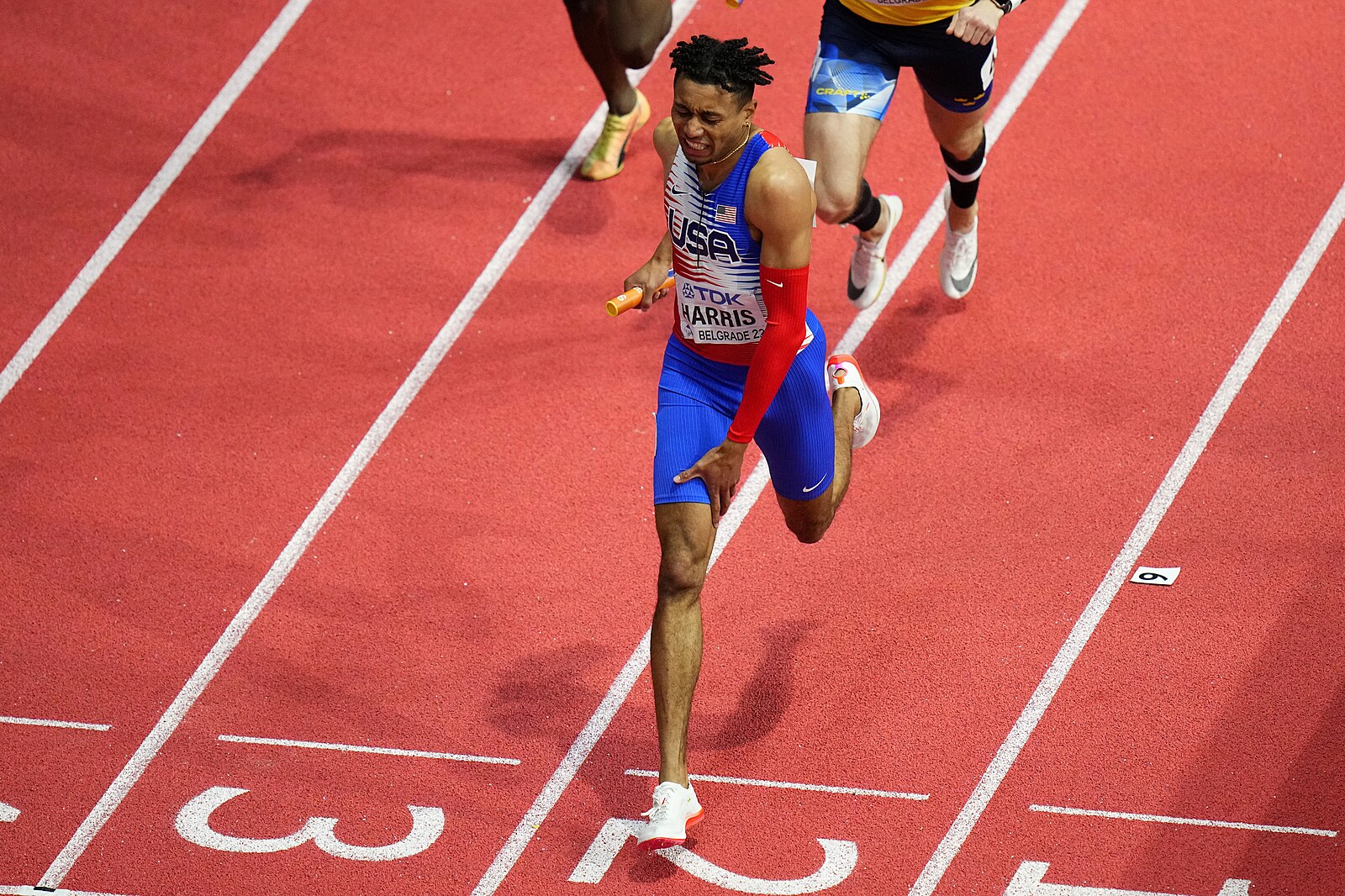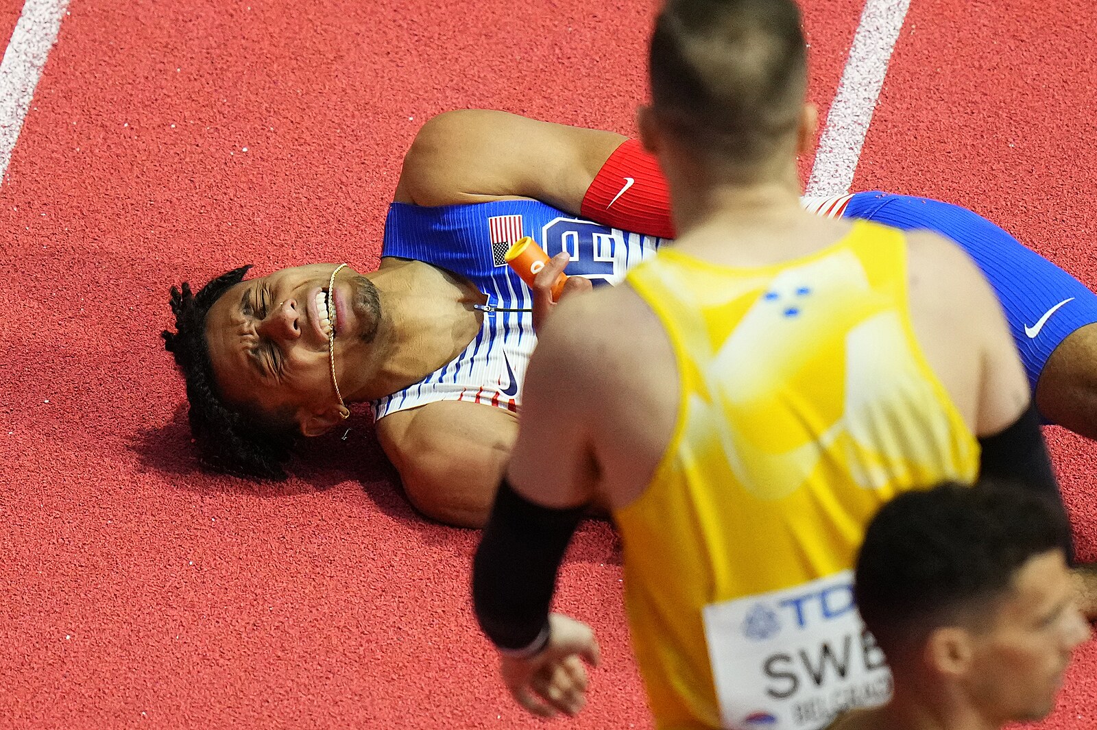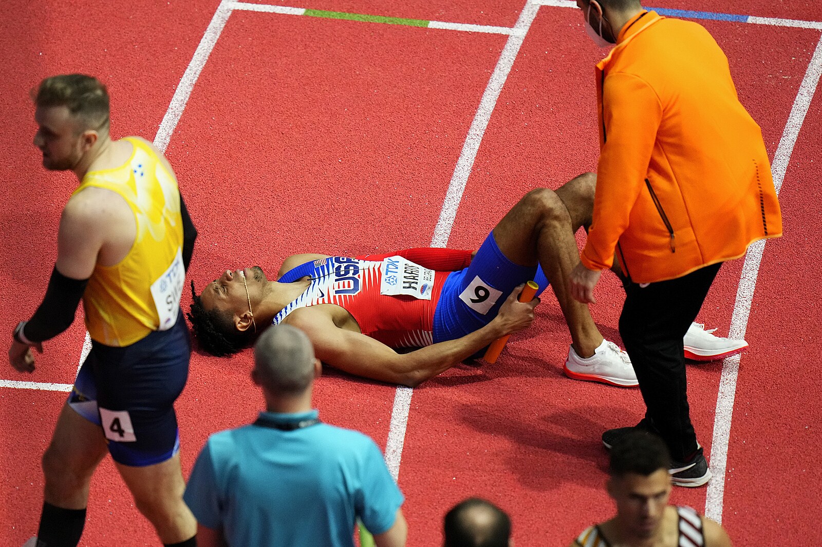 Americký běžec Isaiah Harris v bolestech dokončil mužskou štafetu na 4x400 metrů na halovém mistrovství světa v Bělehradě.