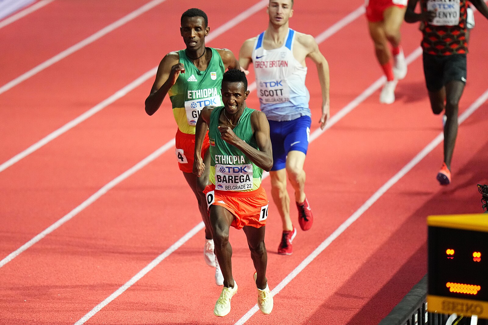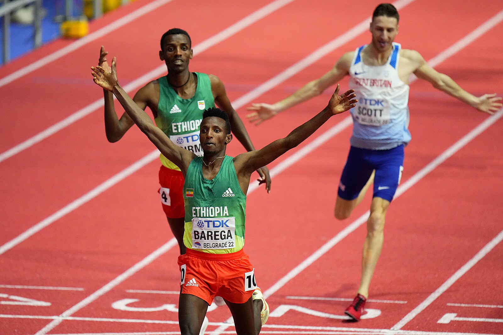 Vítěz mužského běhu na 1500 metrů, Samuel Tefera z Etiopie, slaví.