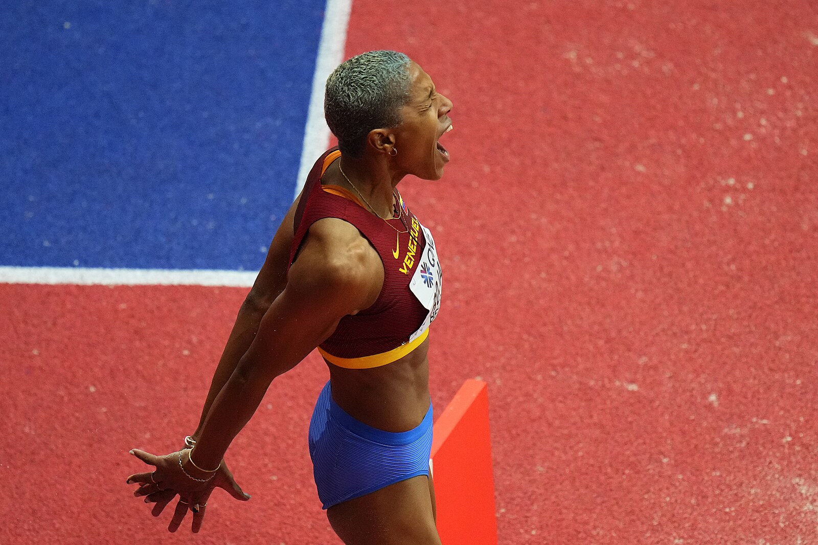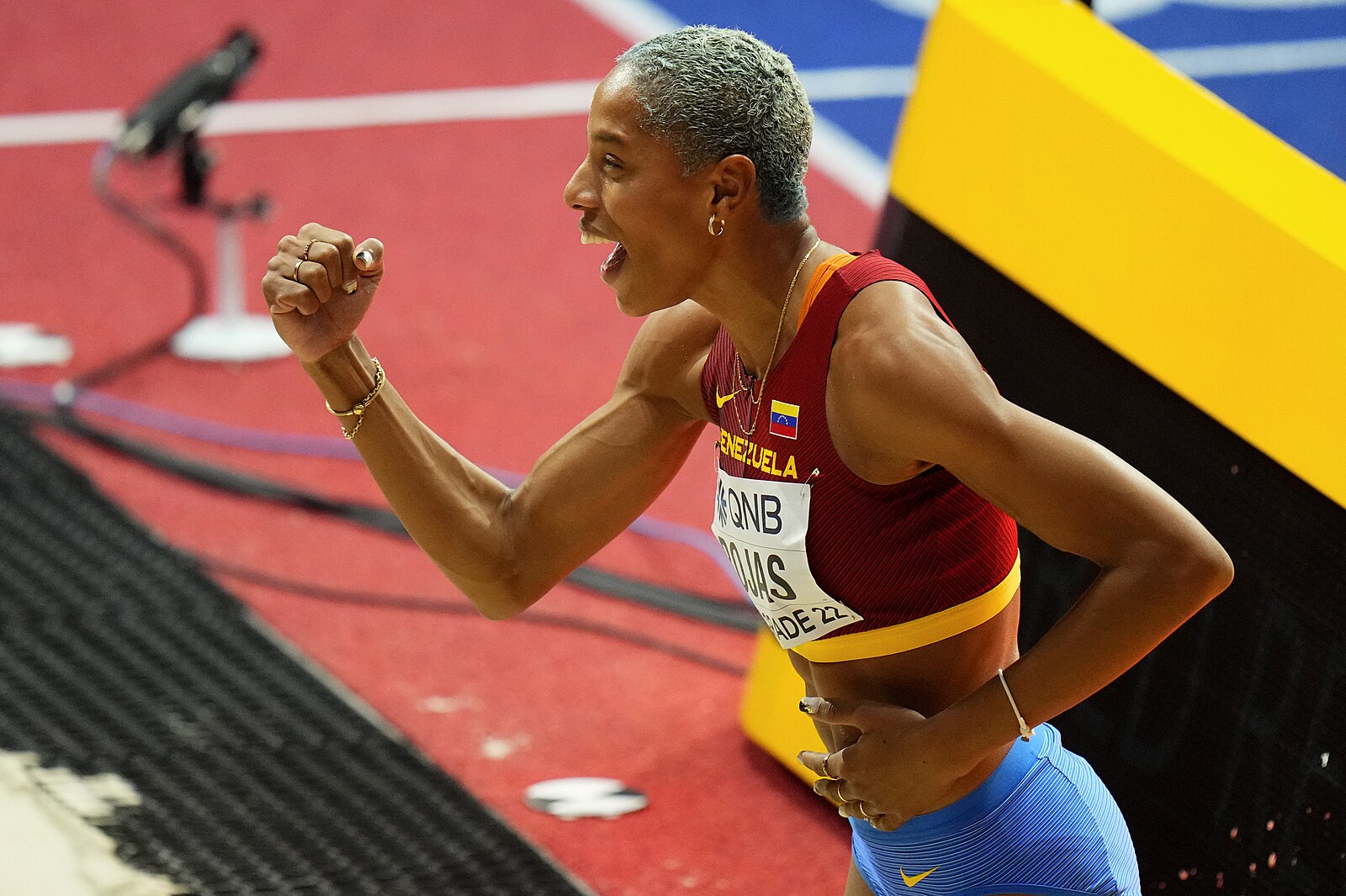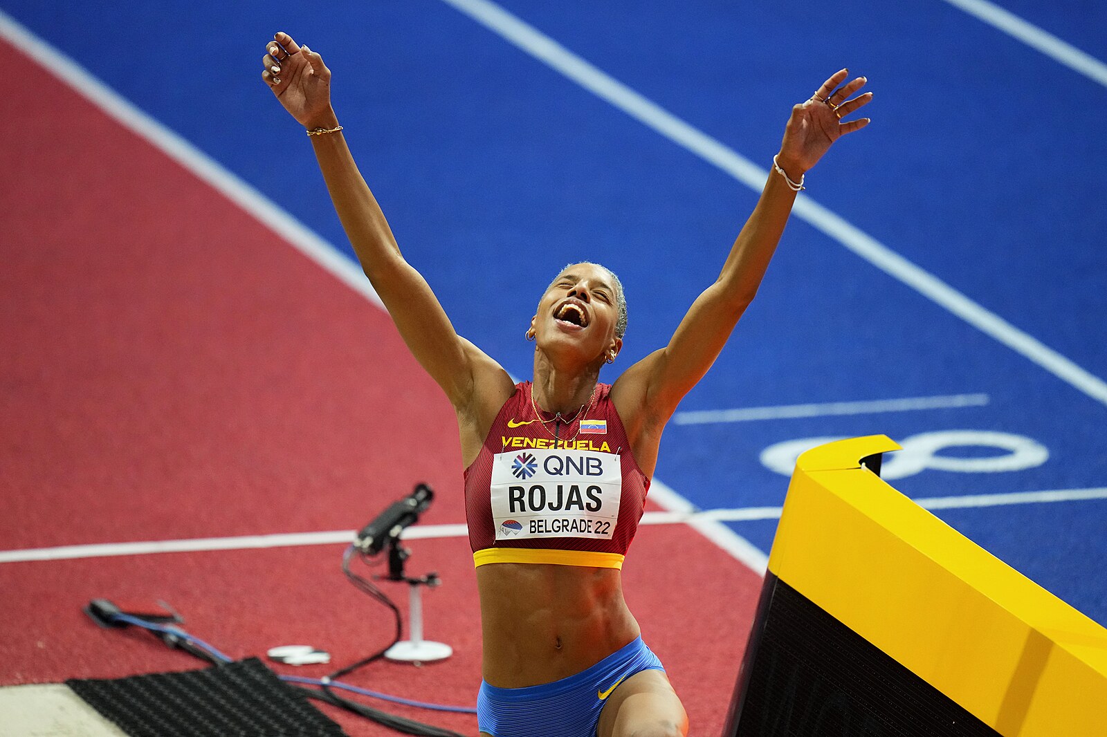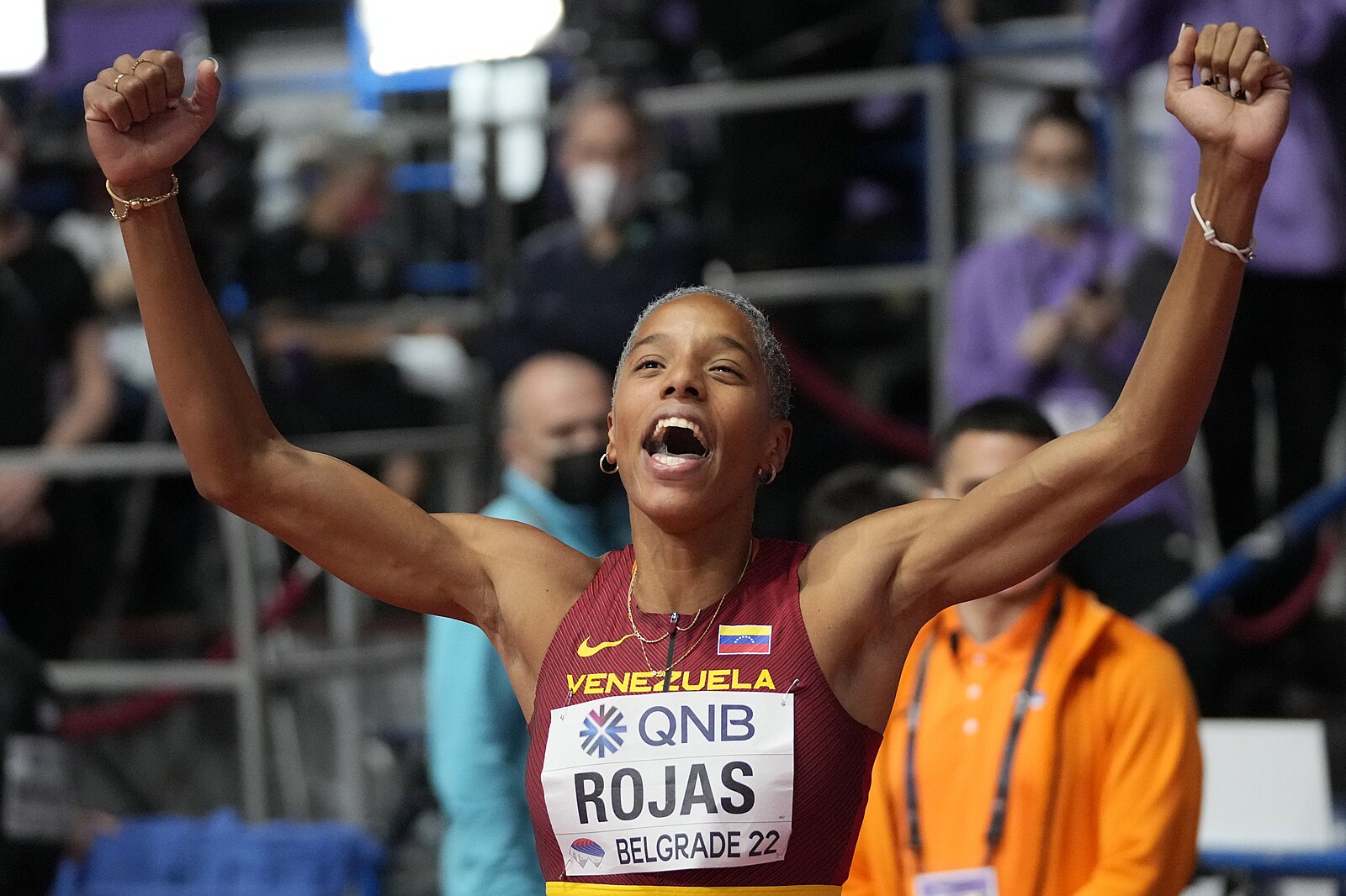 Reakce venezuelské trojskokanky Yulimar Rojasové na zdařilý skok během finále na halovém mistrovství světa v Bělehradě