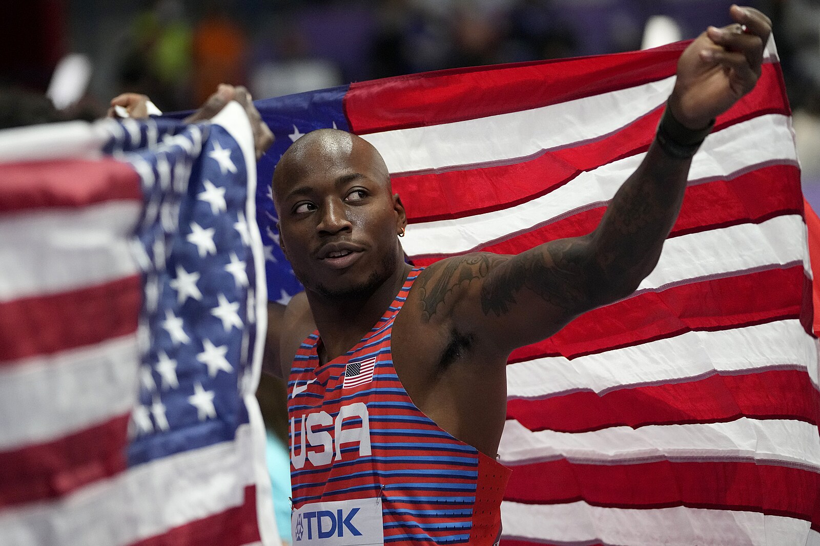 Americký překážkář Grant Holloway se raduje z vítězství ve finále šedesátky na halovém mistrovství světa v Bělehradě.