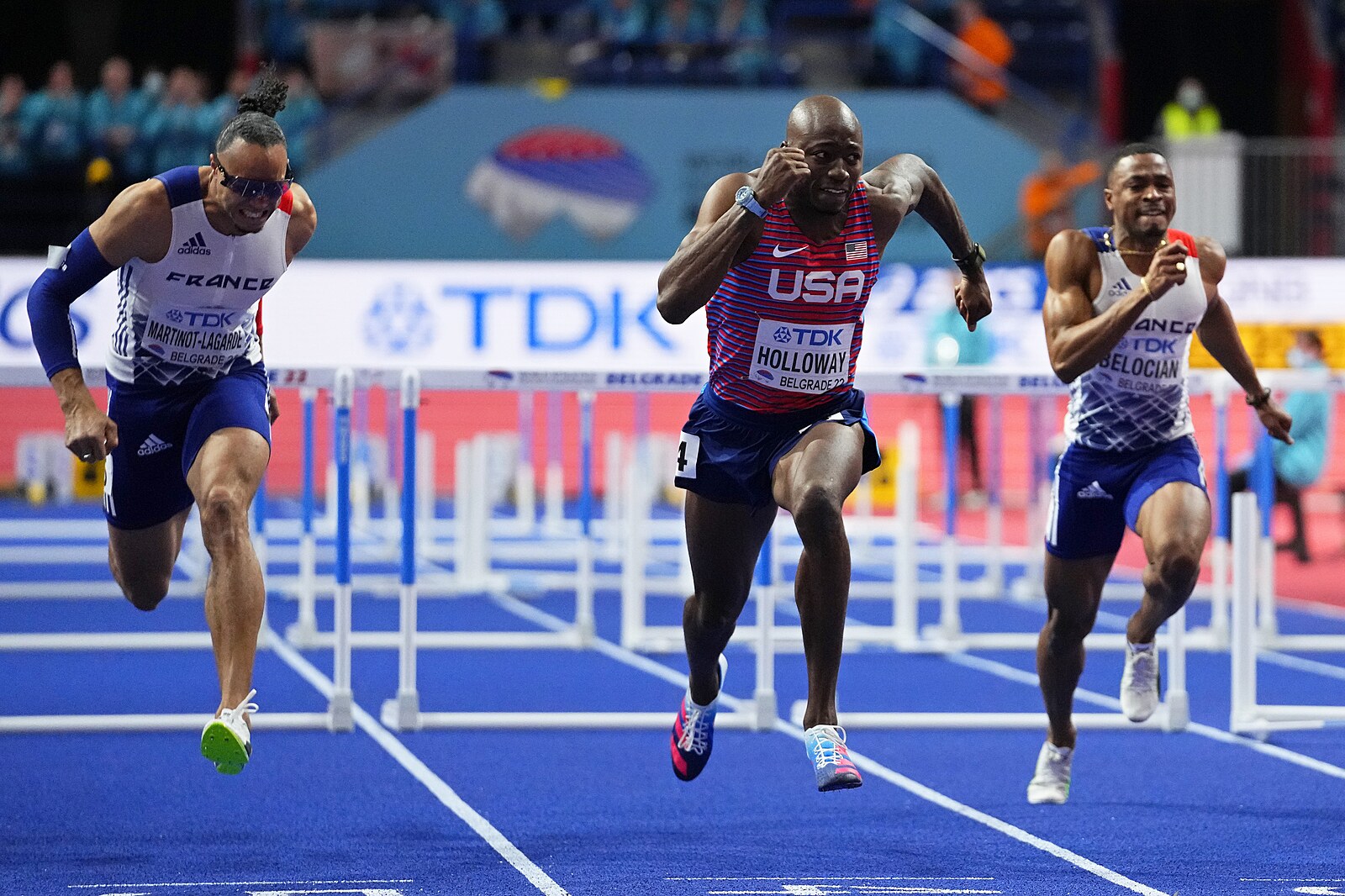 Americký překážkář Grant Holloway dobíhá do cíle finále mužské šedesátky na halovém mistrovství světa v Bělehradě před dvěma Francouzi. Stříbrným Pascalem Martinotem-Lagardem (vlevo) a posledním Wilhemem Belocianem (vpravo). Bronz bral Američan Jarret Eaton (není na snímku).