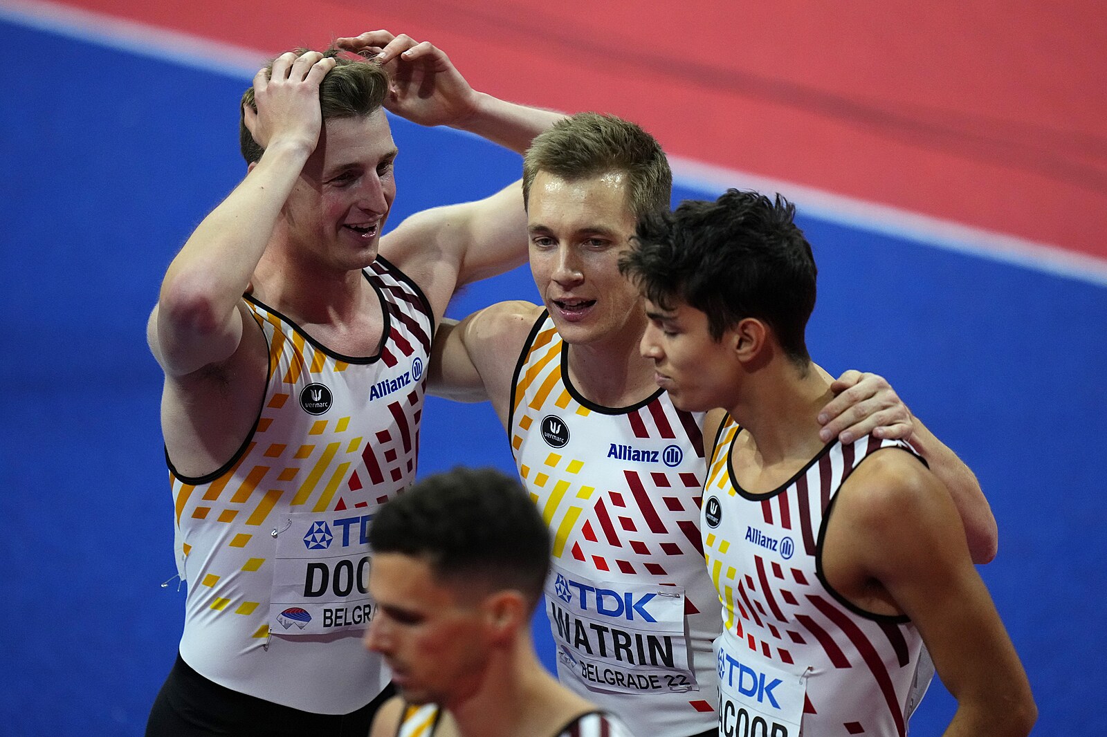 Belgický tým vítězí ve štafetě na 4x400 metrů na halovém mistrovství světa v Bělehradě.