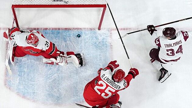 V čase 16:28 už měli semifinalisté loňského mistrovství světa tříbrankový náskok. Střela Markuse Lauridsena se od brusle Brokstranda, který byl před brankovištěm bez hokejky, odrazila k Ehlersovi a ten zamířil do odkryté branky. Lotyši se vrátili do hry 16 sekund před koncem první třetiny, kdy Andersena překonal přes clonu od modré čáry Zile.