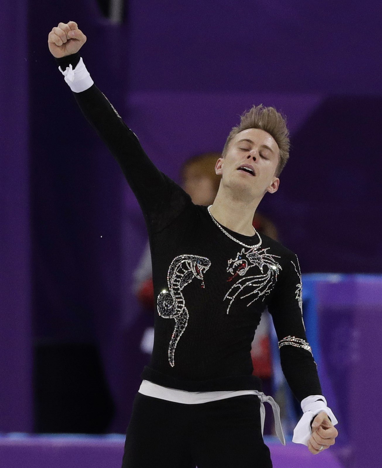 Michal Brezina of the Czech Republic reacts after his performance in the men's short program figure skating in the Gangneung Ice Arena at the 2018 Win ...