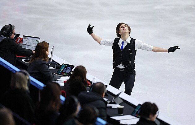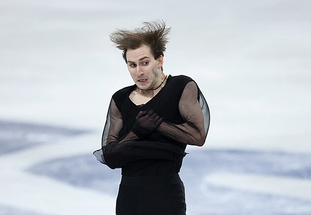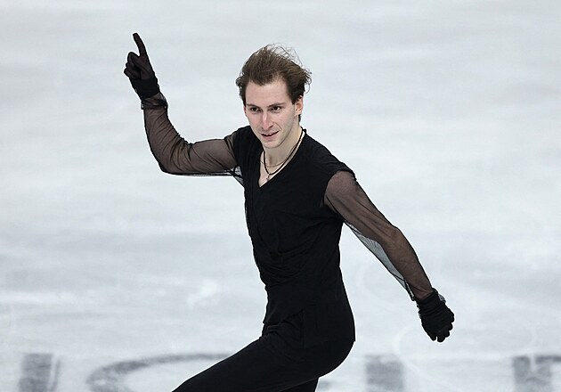 Vítězné gesto Niky Egadzeho po zlaté jízdě na mistrovství Evropy v krasobruslení.
