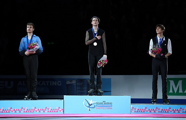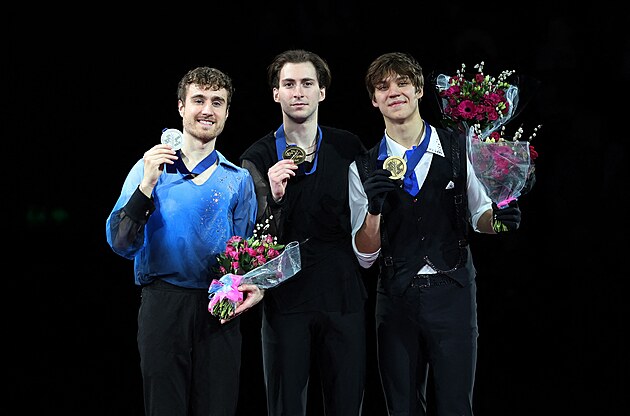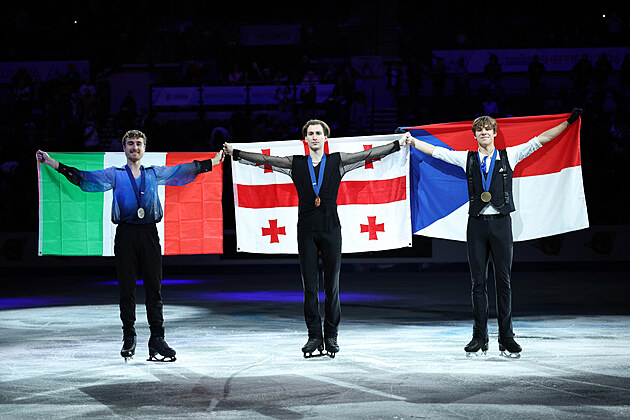 Tři nejlepší muži evropského šampionátu v krasobruslení. Zleva stříbrný Matteo Rizzo, zlatý Nika Egadze a bronzový český reprezentant Georgii Reshtenko.