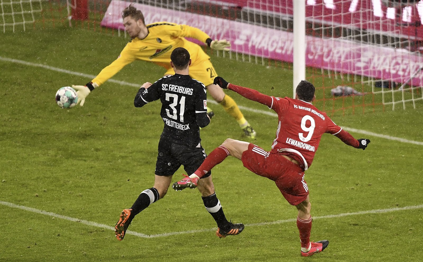 Robert Lewandowski odvrací centr Werderu Brémy.