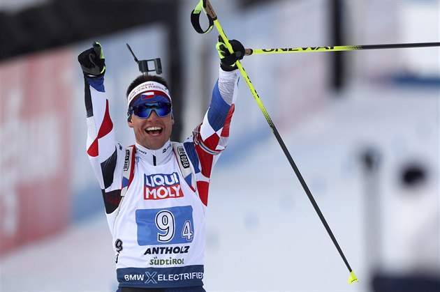 A už tu byl cíl. Dumal: Co mám udělat za gesto. Chtěl ukázat na českou vlajku na čepici, ale nakonec poslal polibek divákům a euforicky vymrštil ruce nad hlavu.