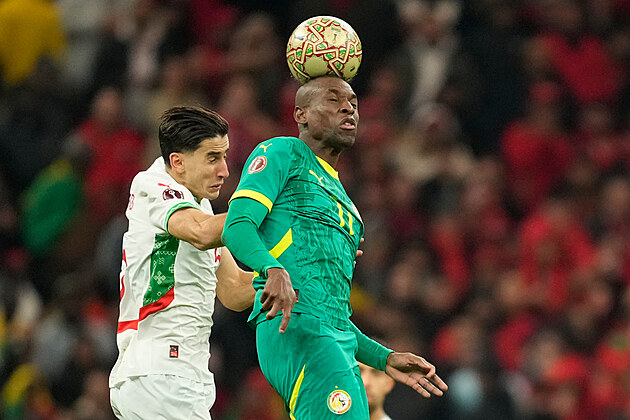 Senegalský útočník Nicolas Jackson hlavičkuje v souboji s Nájífem Aguerdem z Maroka.