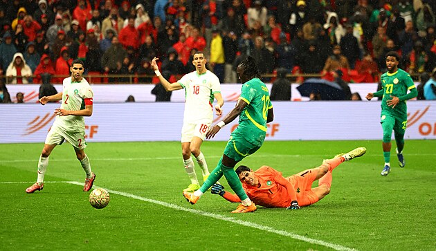Marocký útočník Brahim Díaz střílí z pokutového kopu slabě a doprostřed, senegalský brankář Mendy jeho pokus chytil.