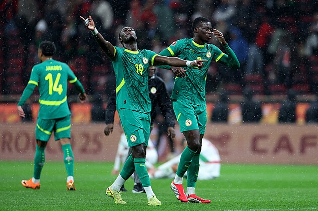 Senegalští fotbalisté Ismail Jakobs a Moussa Niakhate slaví vítězství na africkém poháru.