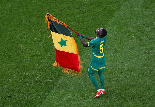 Senegalský záložník Idrissa Gueye slaví s vlajkou vítězství na africkém poháru.