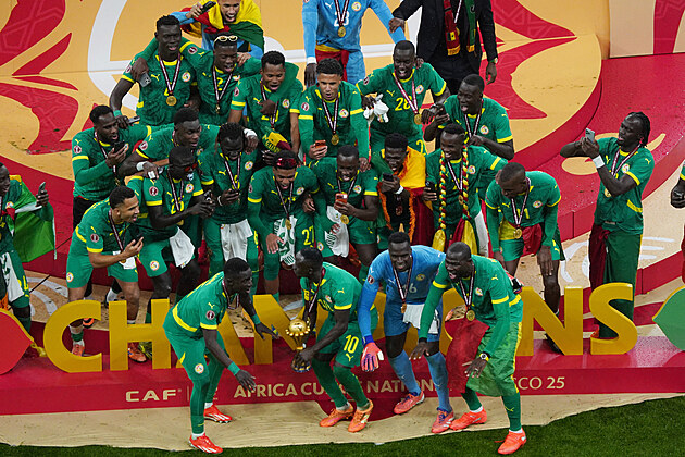Senegalský kapitán Sadio Mané slaví s pohárem vítězství na africkém šampionátu.