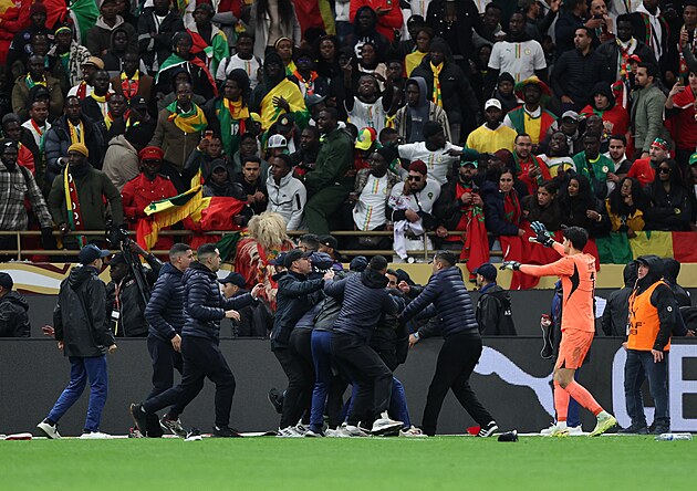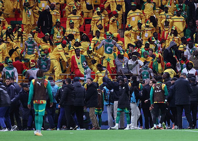 Senegalský kouč Pape Thiaw odvádí hráče ze hřiště po nařízené penaltě pro Maroko v závěru finále mistrovství Afriky.