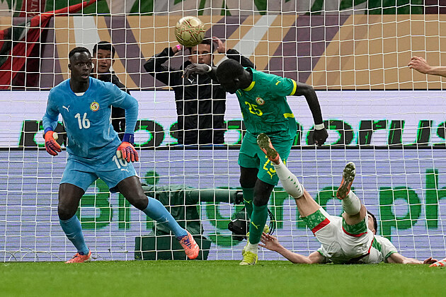Senegalský obránce El Hadji Malick Diouf se ve finále proti Maroku snaží hlavičkovat poté, co v pokutovém území fauloval soupeře.