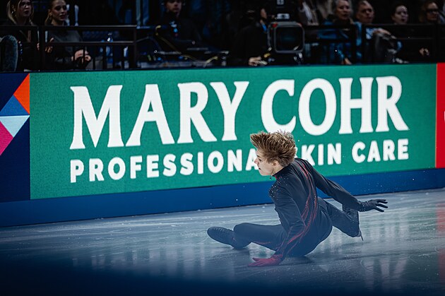 Český krasobruslař Georgii Reshtenko padá během krátkého programu na MS v Praze.