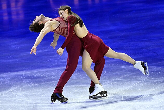 Francouzský taneční pár Laurence Fournierová Beaudryová a Guillaume Cizeron při závěrečné exhibici na mistrovství světa v Praze.