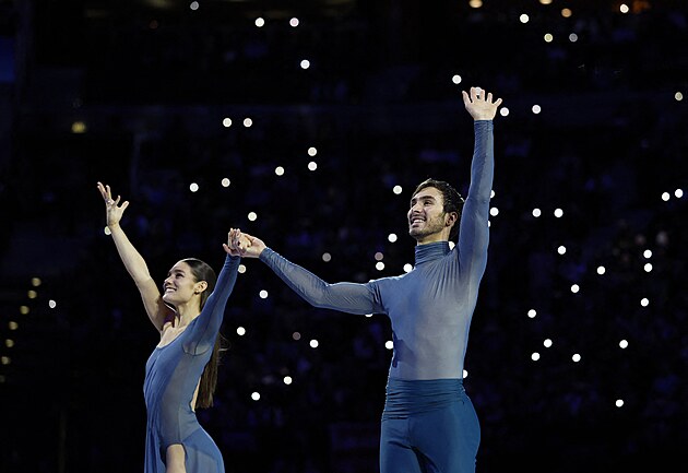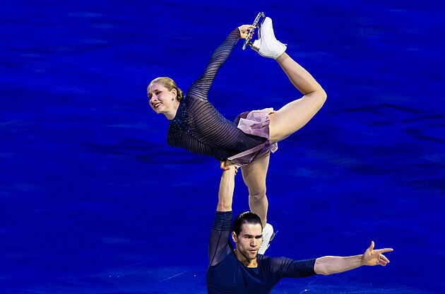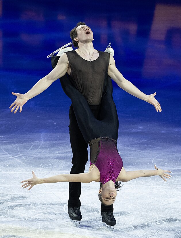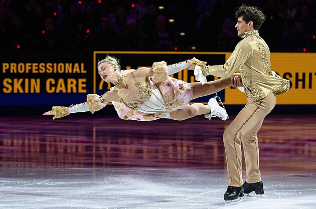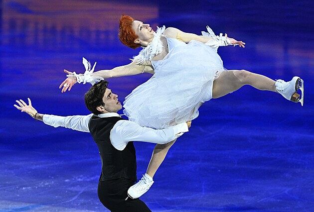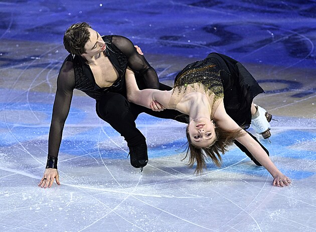 Taneční pár Jevgenija Loparevová a Geoffrey Brissaud během nedělní exhibice na MS v krasobruslení v Praze, 29. března 2026.